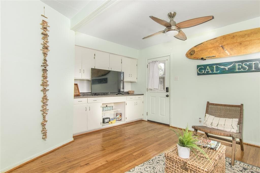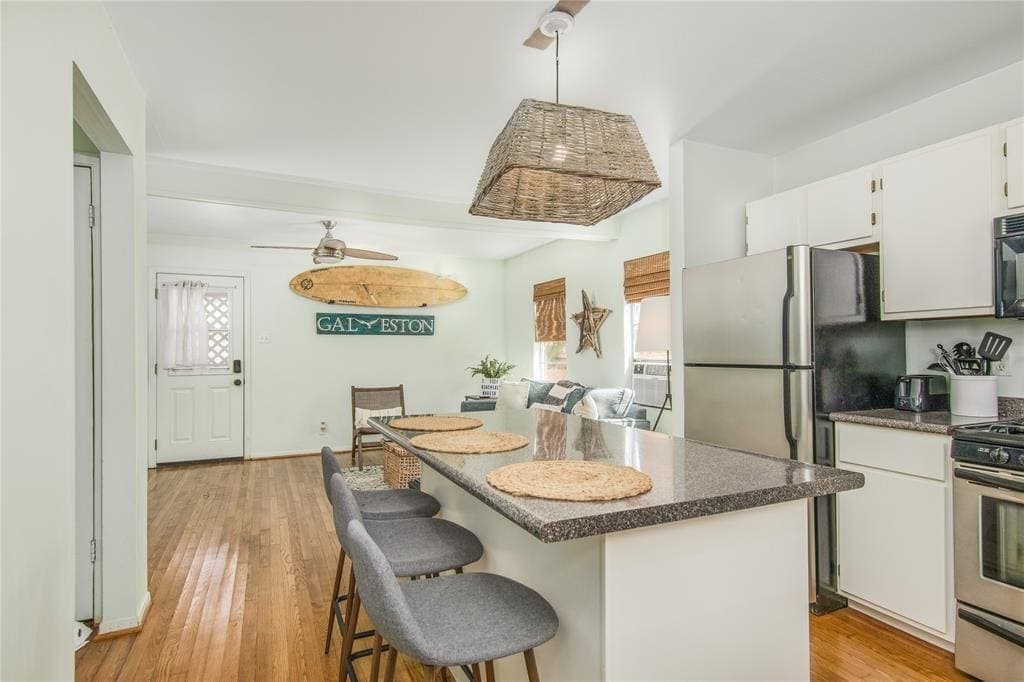 Welcome to your Galveston vacation with an open concept living room that flows to kitchen.